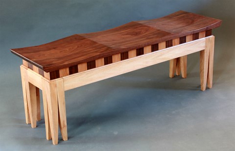“Multi-Legged Bench”, black walnut and American sycamore. 50″w x 14″d x 18″h.