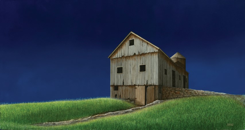 “I call them the old gray ancients,” says Stephen Ray about the barns he paints. Ray works in acrylics on wood panels, and his beautifully rendered barn “portraits” reveal as much about the artist as they do about America’s most iconic rural structures. “My affinity for these weathered barns stems from both my appreciation for woodworking and my respect for the grace-filled farming way of life, which is disappearing all too quickly.” He often chooses an unusual vantage point, painting a barn on an open, barren hillside, standing alone against an ominous sky. From this view they seem almost mythic, like a pyramid or a cathedral.