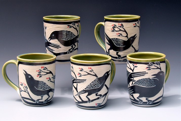 “Bird Mugs”, wheel thrown white high fired clay, decorated using sgraffito technique.
