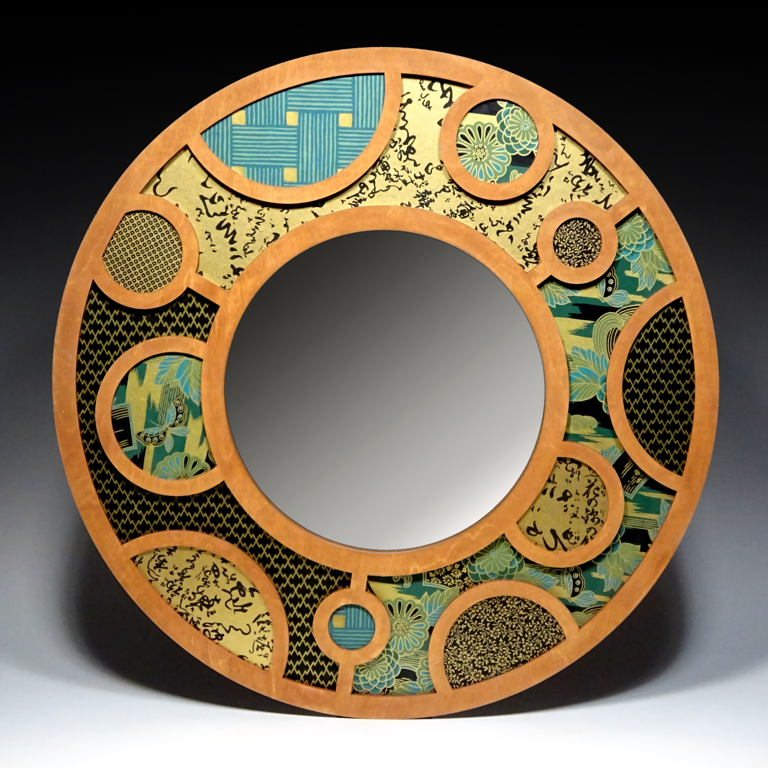 Karen Krieger's work explores paper, occasionally combined with metal, in both two and three dimensions. The design challenge is bringing order to chaos and using geometric rigidity to rein in unruly patterns. She says, "After years of working in a silver-black palette, I’m energized by these infinite combinations of color and pattern. I’ve stitched abstract collages and collars, woven small works for the wall, and constructed jewelry that combines silver structures with hand-stitched, hollow forms." "Bubble Mirror": wood, paper and mirror; 21" diameter. Pittsburgh, PA 15216.