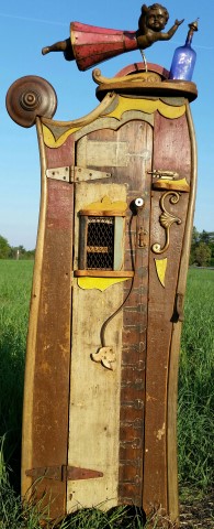 Rich Dunbrack combs the countryside searching out old tools, farm implements, architectural elements, musical instruments and oddball found objects to create his one-of-a-kind grandmother clocks, armoires, cabinets and tables. “Curiousity Cabinet”, 7 feet tall