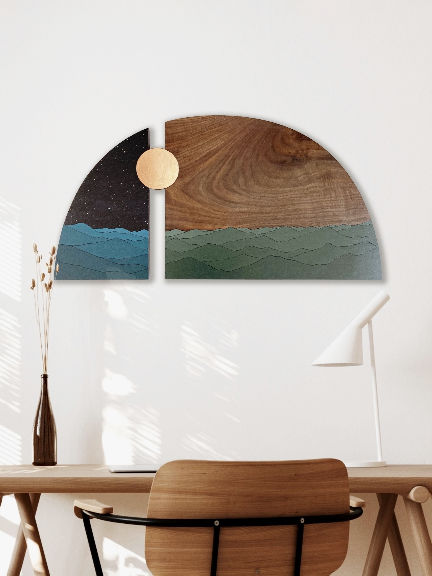 I am a self-taught artist making modern, nature-inspired wooden art and decor that blends organic elements with geometric design. My work combines woodworking, painting, and pyrography, all crafted by hand from start to finish in my woodshop and home studio.