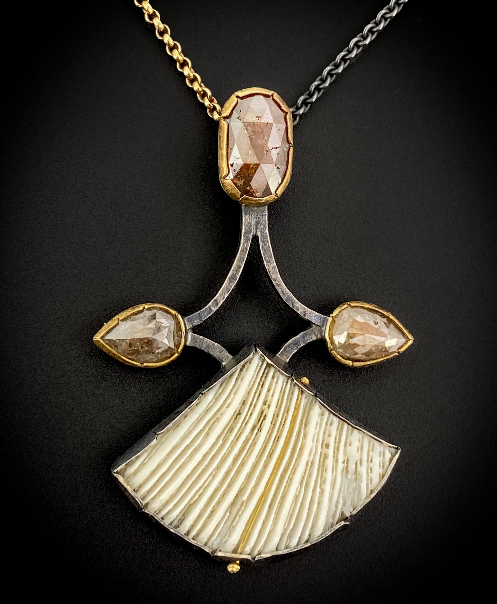 Wearable sculptures that blend geological history with modern design; using fossils, coral, and meteorite, paired with fine gemstones and precious metals.