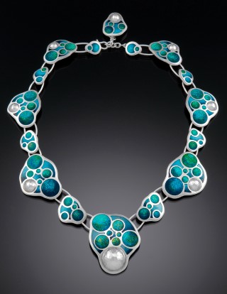 Jeweler Molly Strader creates contemporary designs with trademark hammered disc shapes from silver and gold adorned with enamel and semi-precious stones. “Growth of Form” Necklace, silver and enamel. 11″ x 9″ x .75″. Perrysburg, OH 43551; Jewelry