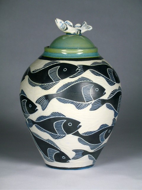 “Fish Jar”, wheel thrown white high fired clay, sgraffito carving, hand sculpted ornament.16″ tall.