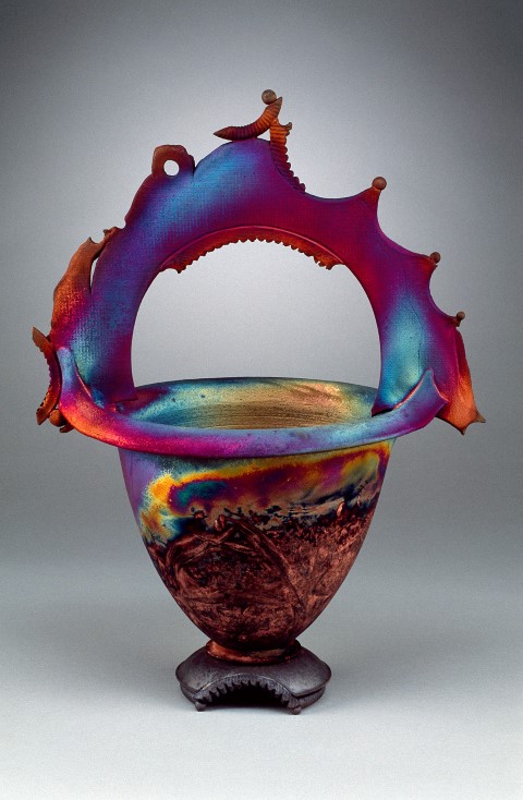 “Handled Vase”, wheel thrown, raku fired stoneware, 20″h x 18″w x 9″d.