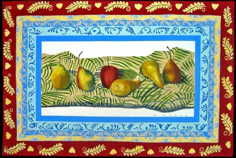 “Five Pears and an Apple”, painted floorcloth on durable canvas. 26″ x 39″.
