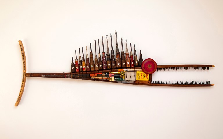 “Alfred”: Found object fish created from a vintage crutch, old screw-drivers, and much more.