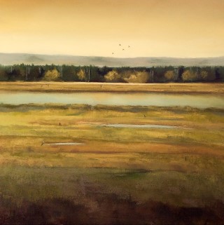 Roxane Chardon uses muted tones to create her understated landscape and still life paintings.Working in pastels and oil paint, she produces images that are representational, but that sometimes soften to the point of near abstraction. “Golden Haze”, pastel on paper. 14″ x 14″