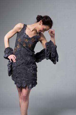 Janice Kissinger’s wearable art pieces are built, rather than sewn. Beginning with natural, loose wool fibers, both the material and the item are made at once in a sculptural process involving just soap and water. Kissinger uses luxury materials – fine Merino wool, reclaimed vintage silk saris and her own hand-dyed silk. Her studio is in an old cotton mill in Rhode Island.