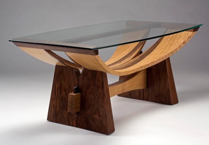 Talk about an exciting coffee table! Crafted of oak and walnut by Maine furniture maker David Talley, it’s part of his new Kensho Collection. The supernal arch supports the heavy glass top and its Asian-inspired Arts and Crafts base lends stability. Talley’s furniture evokes a classic minimalism that marries well with both contemporary and traditional deco. He has discovered the truth in the words ‘form follows function’.