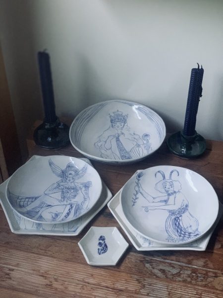 I create organic illustrations inspired by medieval iconography, bucolic sensibilities and moments depicting folklore and human pleasures. Using hand built and wheel thrown techniques I create work that is reminiscent of pastoral place settings reinvented for a new era.