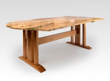 “Live Edge Trestle Dining Table”, inlaid with resin and natural stones. 72″ long.