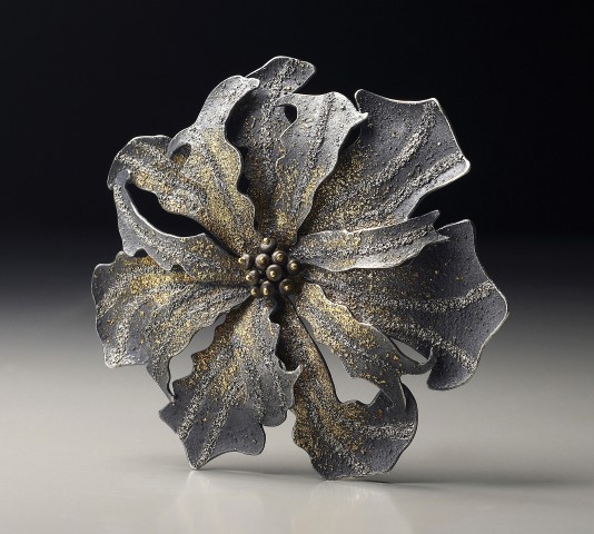 “May” Brooch, platinum, 22K, and 24K gold, O-dong(Shakudo), Sterling silver. 9.0 x 10.5 x 2.0 Centimeter.