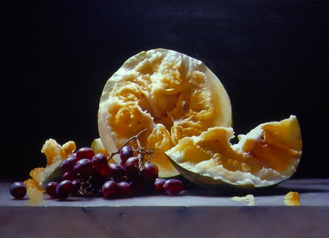 “Melon and Grapes”, oil on linen, 18″h x 24″w.