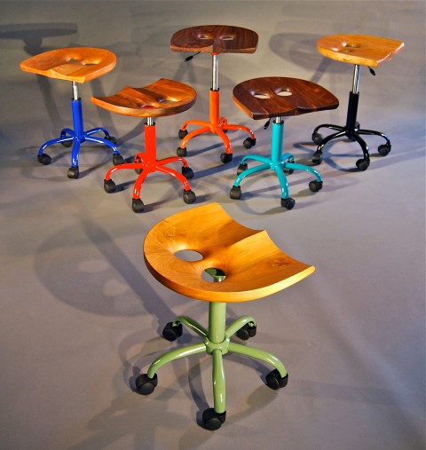 “Rolling Owl Stools”, cherry or walnut with a powder-coated steel base adjusts from 18″ to 24″ high.