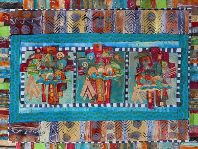 “Colorful Quilt with Borders”, handmade paper painted with acrylic and patterned. 50″w x 36″h.