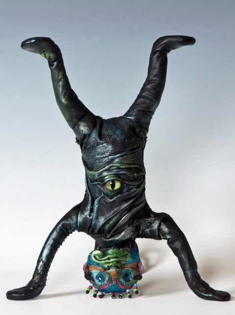 Wendy Ellertson's "Wiliseeyu", a real party animal, stands on his feet or on his head - either way, he's up for a good time! Fashioned of leather, beads, paint, imagination and an eyeball in his belly, he joins a whole tribe of creative creatures who populate Ellertson's story-rich world.