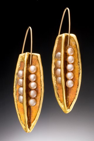 “Pea Pod”, made of layered translucent amber Mica, 23K gold leaf, and freshwater pearls.