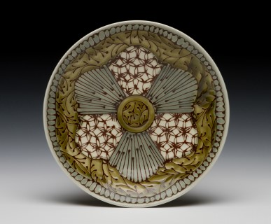 “Persian Bowl”: Wheel-thrown porcelain bowl, hand-drawn and etched patterns, multiple glazes, fired to cone 7 in oxidation; 12″ x 3″ x 12″