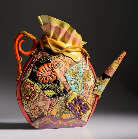 Gail Markiewicz says, “This hand built ceramic piece uses a unique process where I press antique and contemporary textures into clay. The surface is hand painted with thinned out colored clay which allows for color to be imbedded in the surface. Another layer of color is added through the use of various glazes.