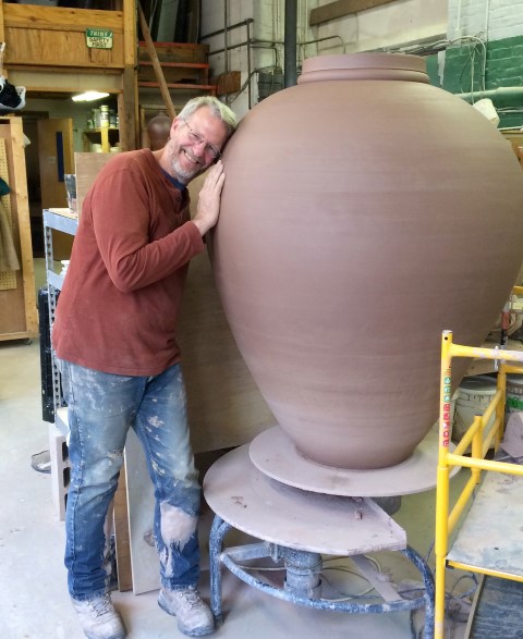 Stephen Procter’s majestic, hand-thrown ceramic pots are a new addition to Paradise City in 2016. His collection of monumental vessels are perfect accents inside the home or outside in the garden. Moving such large pots from the wheel to the kiln is an exercise in strategic engineering!
