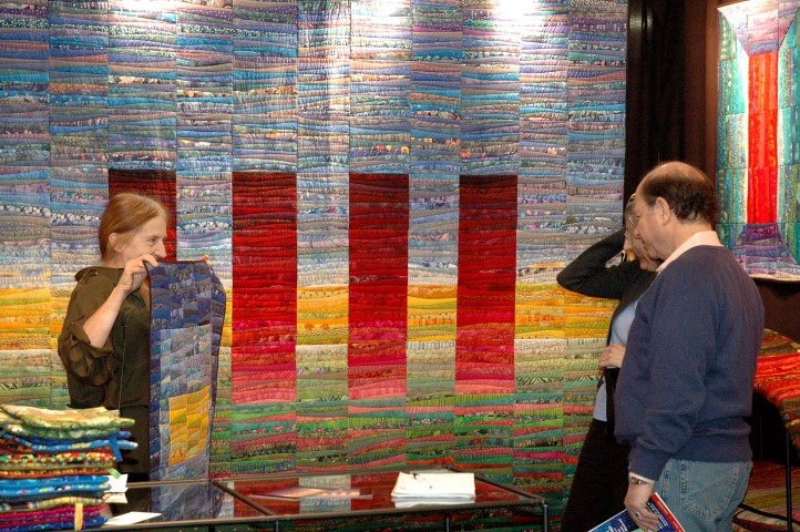 She says, “My quilts are about design, color and the nature of quilts. It seems everyone relates to quilts. We all know the feel of fabric and we are all amazed at the intensity of labor that goes into a traditional quilt. I am trying to recapture these memories while making pieces that are contemporary.”