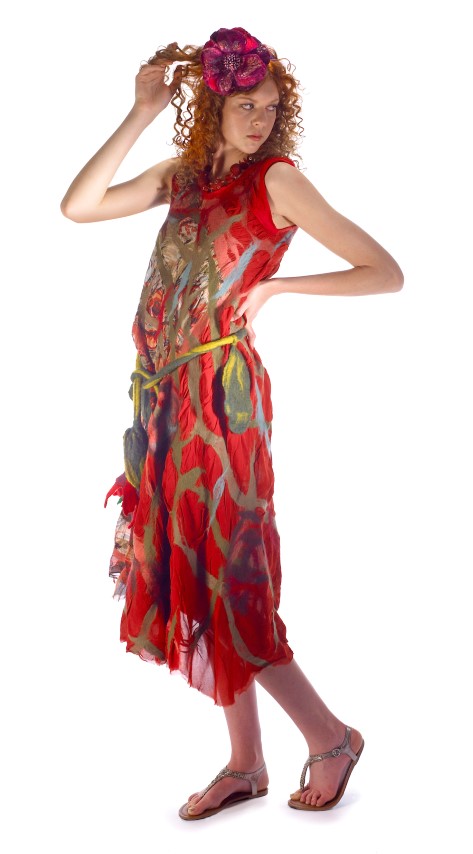 Barbara Poole uses a combination of felting techniques to design adorable hats, scarves and astonishing coats and dresses that epitomize the term “wearable art”. She says, “My clothing and accessories embody the Bohemian lifestyle. I think of my work as BoHo Chic.”