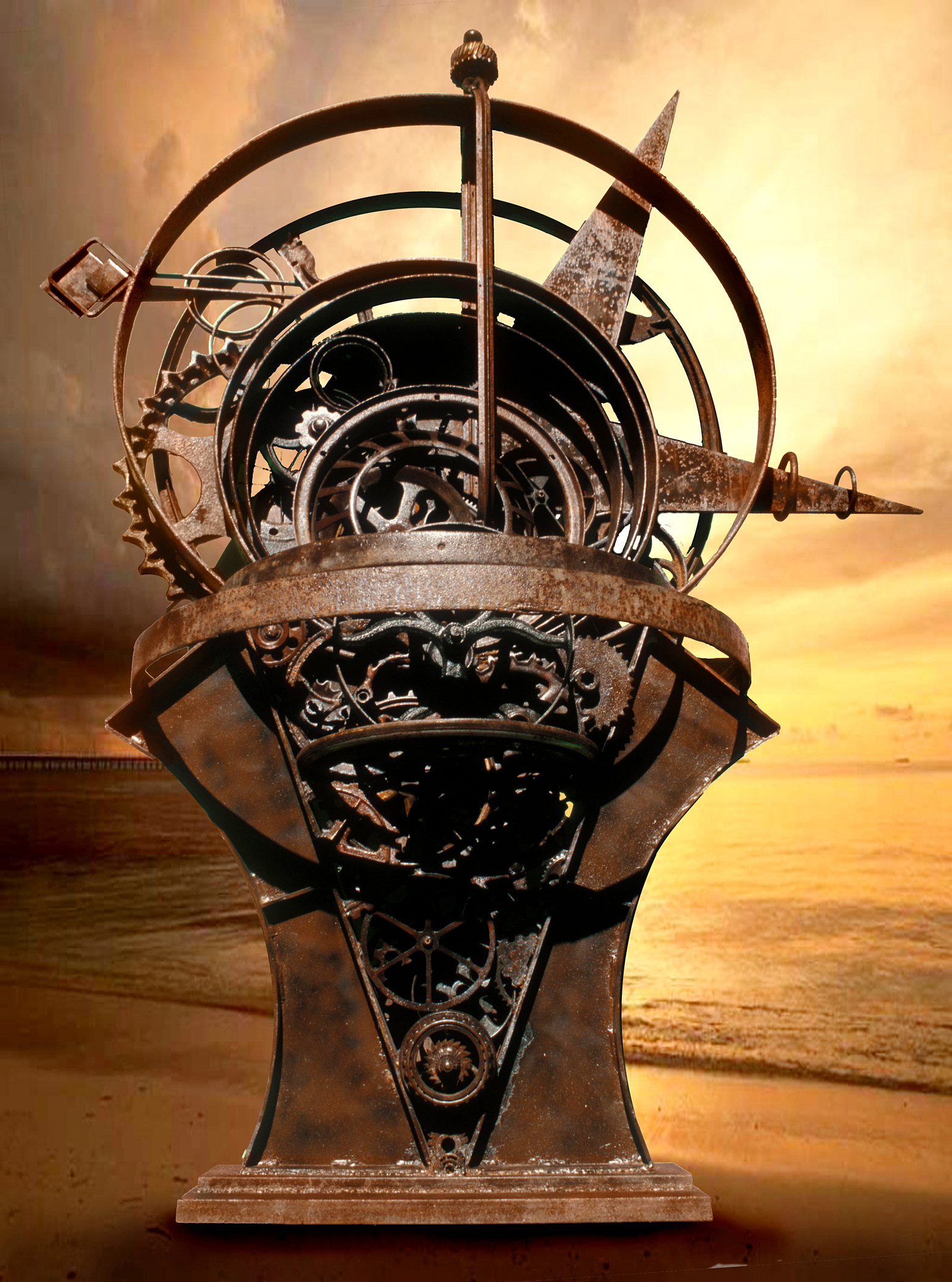 James Kitchen has been welding scrap metal into sculpture for the past eight years, and continues to gain recognition in the world of fine arts, selling to an ever widening circle of collectors nationwide. All of the metal in his sculptures come from local farms, antique stores, auctions, and occasionally a neighbor who leaves a pile of interesting objects in Kitchen’s driveway. Kitchen has a powerful sense of creativity and a nonstop passionate drive, which turns those piles into incredible works of art. He uses nature to mature and nurture his sculptures into the finest rust patina and does little else to alter the metal. “I feel part historian and part archeologist, creating new life,” he says. “In my heart I feel this is my calling in life....everything I have done leads up to this.” "Universe-Sunset" - welded bronze and found objects.