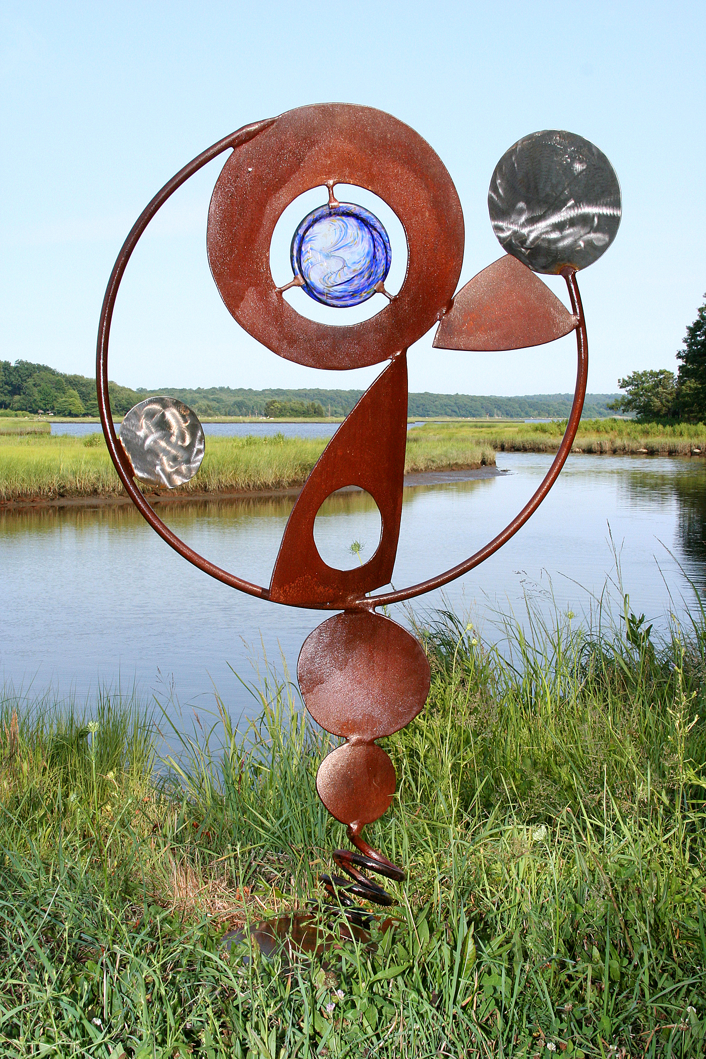 Outdoor sculpture is a wonderful thing. In Whitmore Boogaerts' hands, it reaches for the sky at ten to twenty feet and often incorporates kinetic movement. Boogaerts takes the inner strength of steel and often combines it with the delicacy of fused glass in colors of the sea.