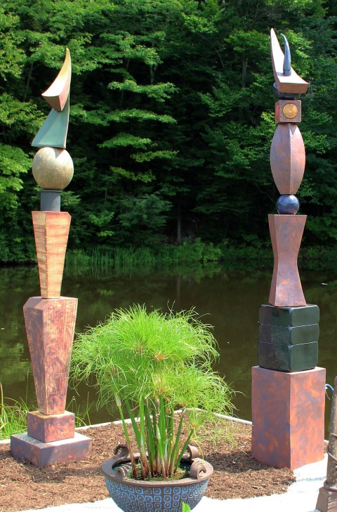 “Sentinels”, hand built slab with brushed iron oxide, underglazes and glazes. 7’8″ tall. Left; cone 6 stoneware. Right; cone 4 red earthenware.