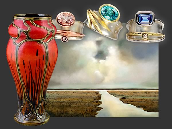 left to right: Stephanie Young, ceramics; Amy Hudon, jewelry; Roxane Chardon, works on paper