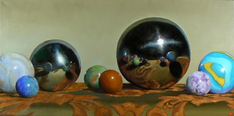 Jeffrey Hayes says, “I couldn’t help but select some of the many antique marbles I own into a group that represents the solar system, and making a larger painting from them. They’re not in the order they exist in space, but from left to right: Neptune, Earth, Saturn, Venus, Mars, Jupiter, Mercury, and Uranus. The lightbulb illuminating the scene is the Sun.