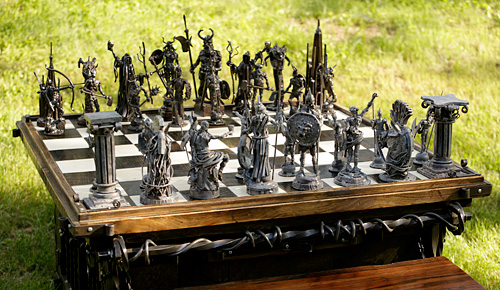 Matt Johnson’s chess set titled Titanomachy refers to ancient Greek cosmogenesis mythology. This oversized set visualizes and celebrates the gods and monsters that occupied mythical Thessaly.
