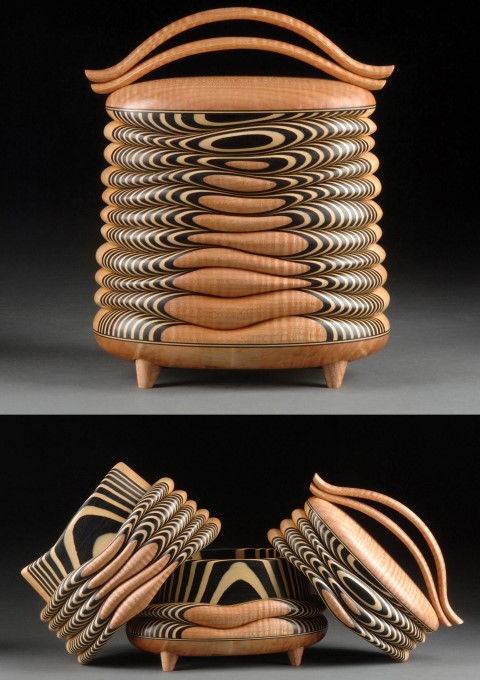 The undulating curves of Terry Evans’ extraordinary wooden boxes bring a fresh meaning to the words “functional art”. Evans is motivated by two obsessions – the desire to create objects of distinction, and the ongoing search for wood species that are visually engaging, whether they are incredibly rare varieties, or common local hardwoods that have somehow been overlooked. He travels to Northampton from Kansas.