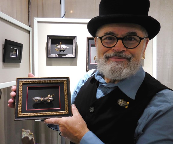 Mark Eliot Schwabe is a jeweler, but not in the ordinary sense of the word. True, his fabrications are meant to be worn, and certainly fulfill the personal adornment requisites of a classic brooch. But what makes his work really stand out? Each piece is a meticulously crafted miniature sculpture offering playful riffs out of the SteamPunk playbook! They combine fine art principles with his affinity for machines, moving parts and SteamPunk imagery. To this rich mix he brings his lifelong interest in all things mechanical, from airplanes and cars to spacecraft, both real and imaginary.
