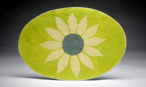“Sunflower Platter”, handbuilt white earthenware with underglazes. 15″w x 10″d x 1″h.