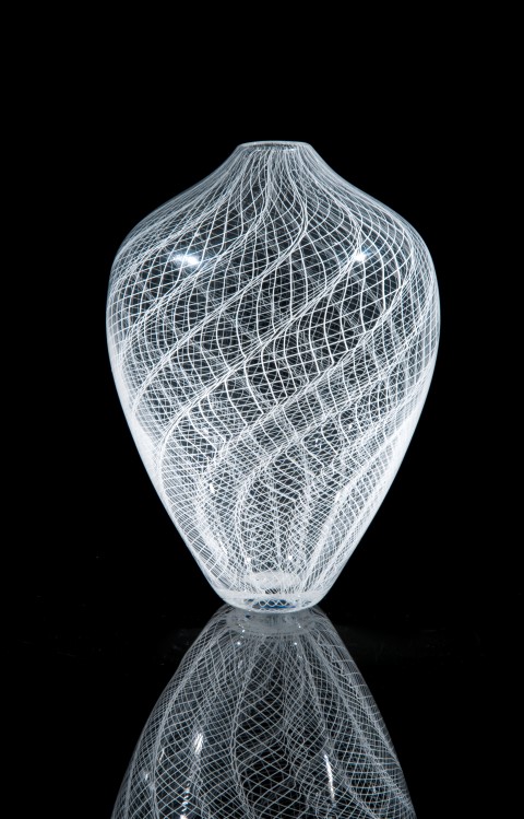 “White Cane Vase”, hand blown glass using white duro cane. 12″ x 7″