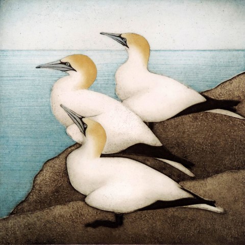 Kathleen Buchanan combines relief blocks with collograph printing to create unique multiple-block images.Her imagery depicts the natural world, with sea birds as a focus. “Three Gannets” is a 4 plate collagraph print. 12″ x 12″.