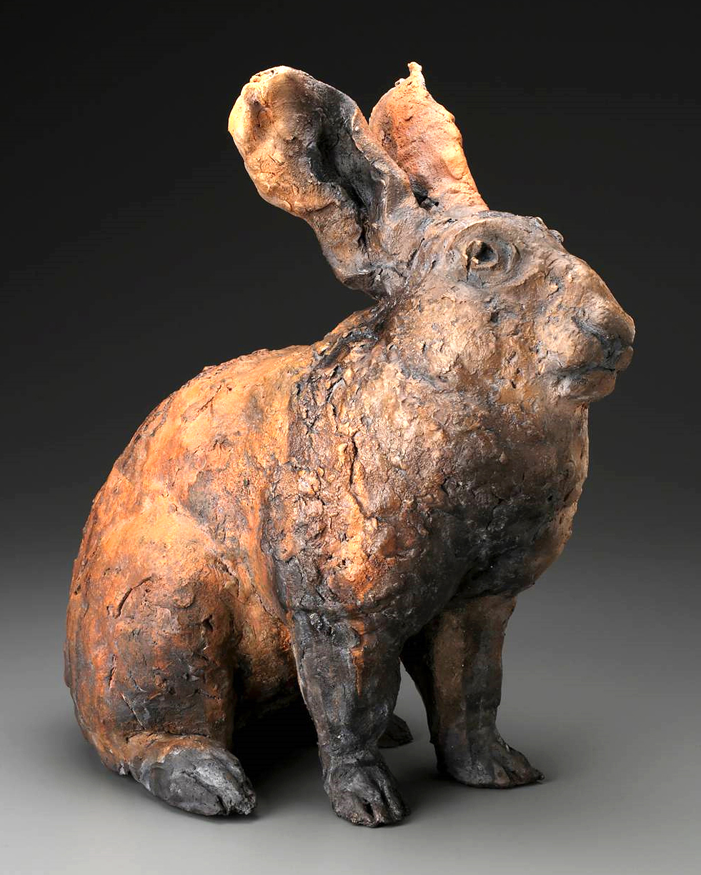 Susan Halls “Uber Bunny”: coiled and slabbed paper clay, raku fired with colloidal slips; 17″ x 11″ x 8″ Easthampton, MA 01027 photographer: John Polak