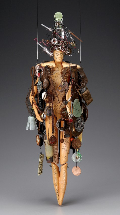“Urban Shaman” – 26″ x 6″ x 3″ – White earthenware, wire, glass and found objects.