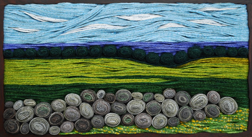 “Rock Wall” Wall Hanging, felt, paint and wood. 28″w x 18″h.
